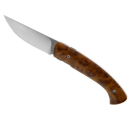 Couteau 1515, lame mate acier 14C28N à cran intérieur, manche 9,5 cm thuya, entretoise mate, entretoise mate, pochette cuir.